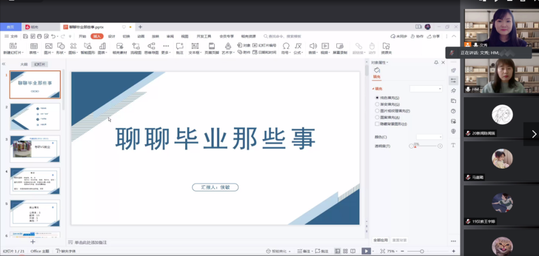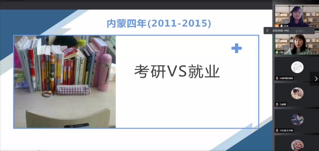 3月19日下午3:00,公司通过腾讯会议在线上开展优秀毕业生就业分享会,邀请侯敏学姐为同学们分享考研以及就业的相关经验。分享会由公司团总支副书记任文秀老师主持,2019级全体本科生参加会议。