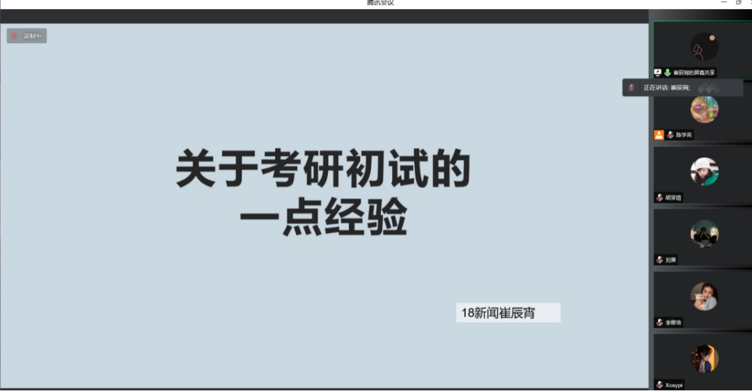 崔辰宵,2018级新闻学专业员工,考研至公司新闻与传播专业。他结合自己的经验,围绕考研初试准备阶段的择校、考试科目的复习等方面进行了细致的讲解,并为同学们介绍了新闻与传播学硕和专硕的区别。