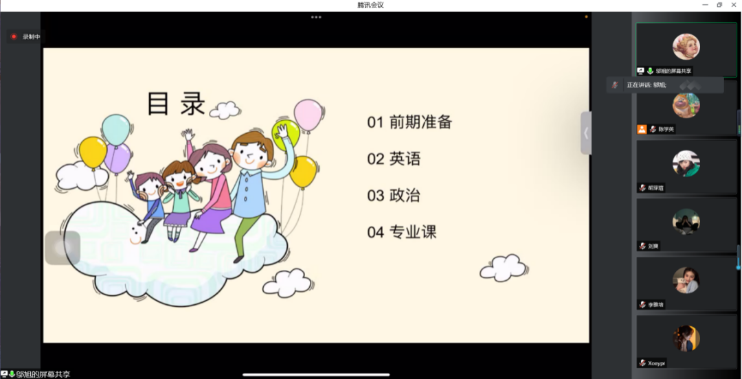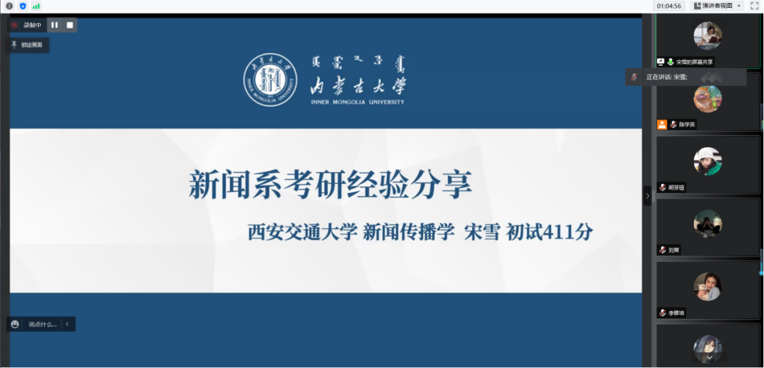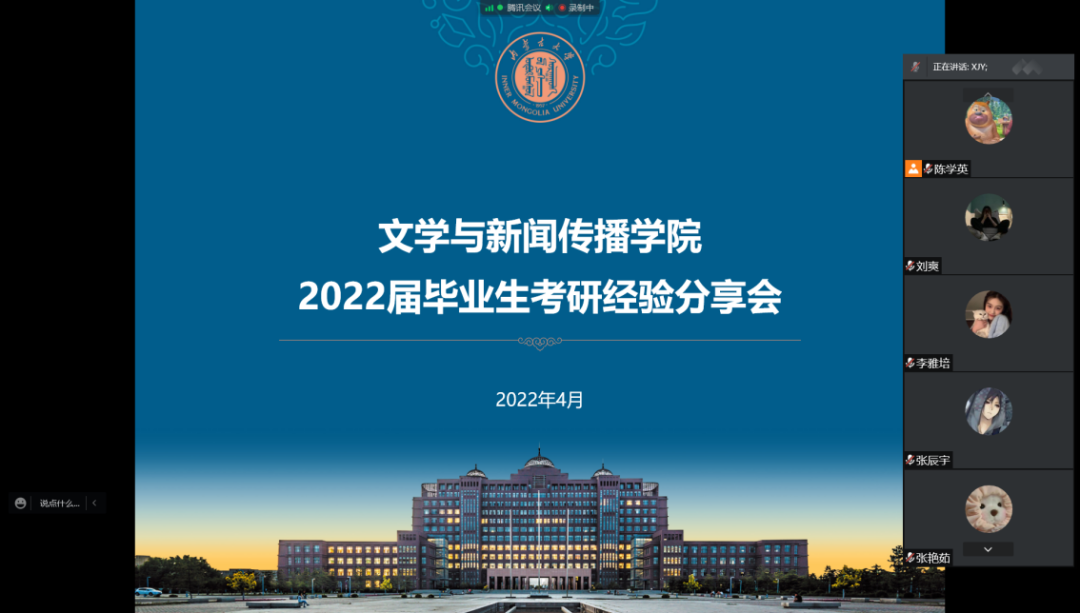 4月12日、13日下午2:30,公司通过腾讯会议分别开展了2022届新闻系、汉语系毕业生考研经验专场分享会,邀请2018级崔辰宵、邬旭、宋雪、吴娱、褚碧涵、董美杉共6位学长学姐为同学们分享考研经验。分享会由公司本科生辅导员邢佳玥老师主持,2019级全体本科生参加会议。