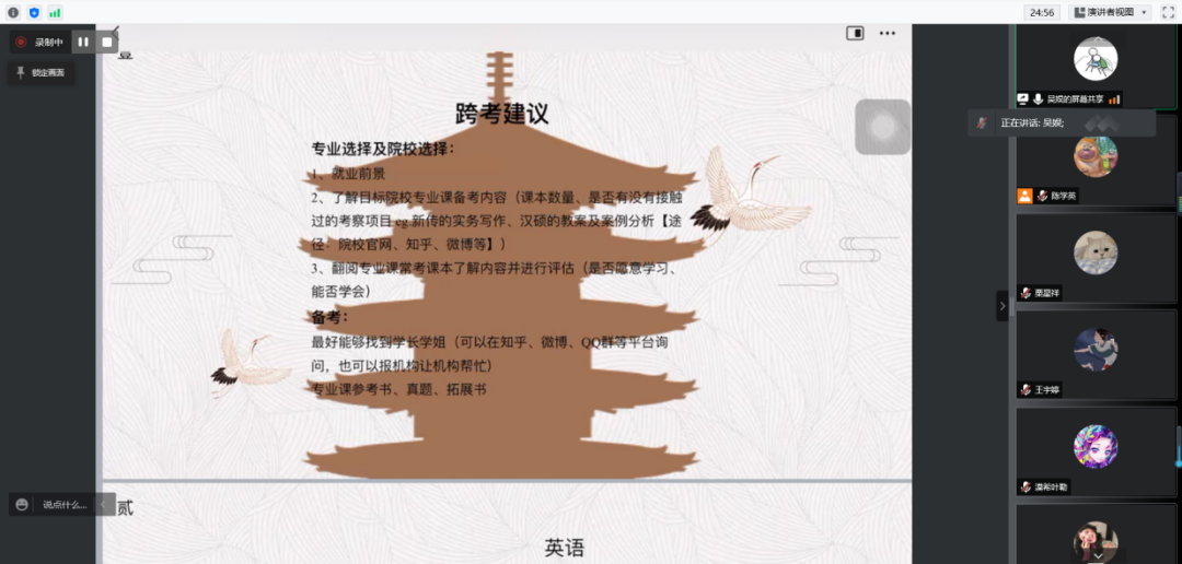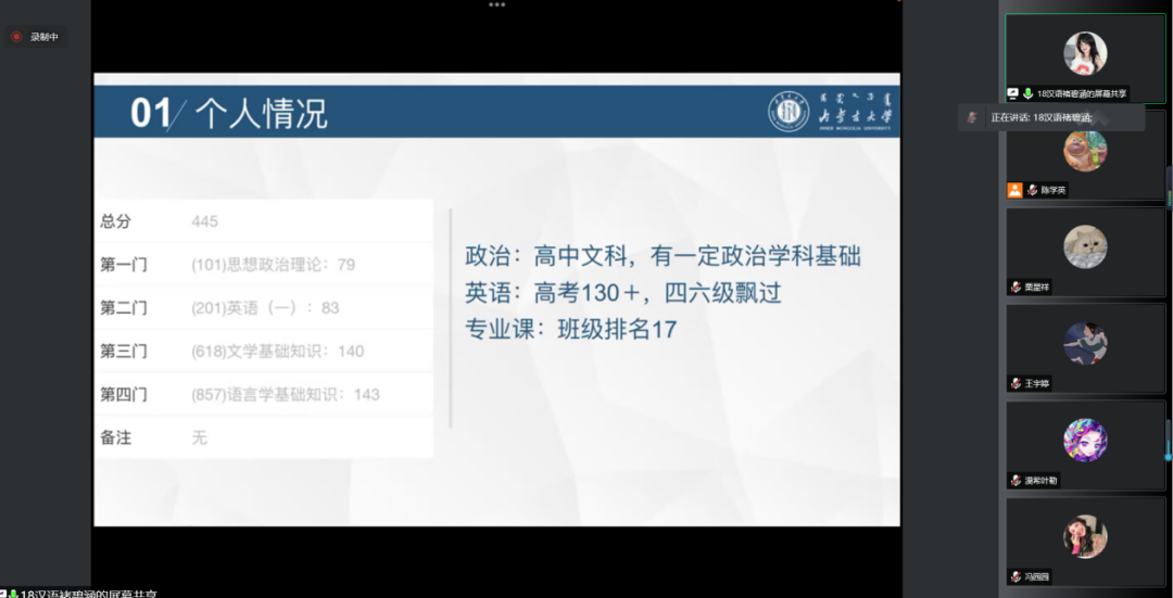 吴娱,2018级汉语言文学专业员工,考研至兰州大学汉语国际教育专业。作为跨专业考研员工,她向同学们分享了一些跨专业考研的经验以及背诵的技巧。她建议同学们在背诵专业课时要多总结、多思考、多积累。在确定目标院校后,要尽早开始准备,打有准备之仗。