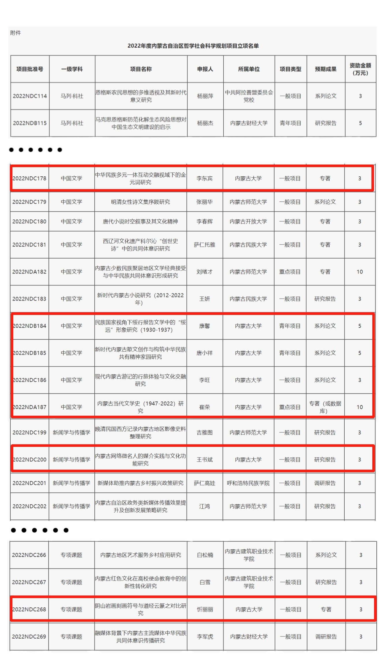 12月7日,2022年度内蒙古自治区哲学社会科学规划项目立项公示,公司有7位老师立项,分别为:崔荣老师,李东宾老师,忻丽丽老师,李旺老师,唐小祥老师、康馨老师,王书斌老师。
