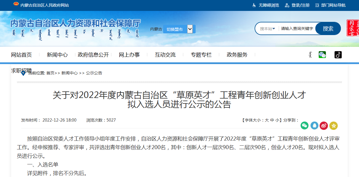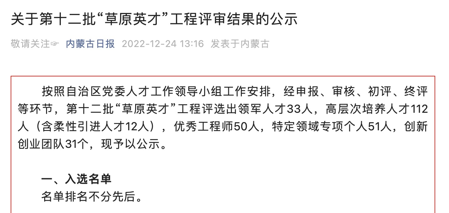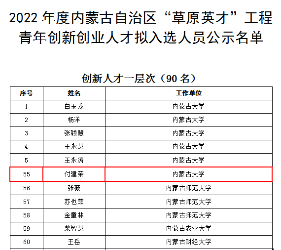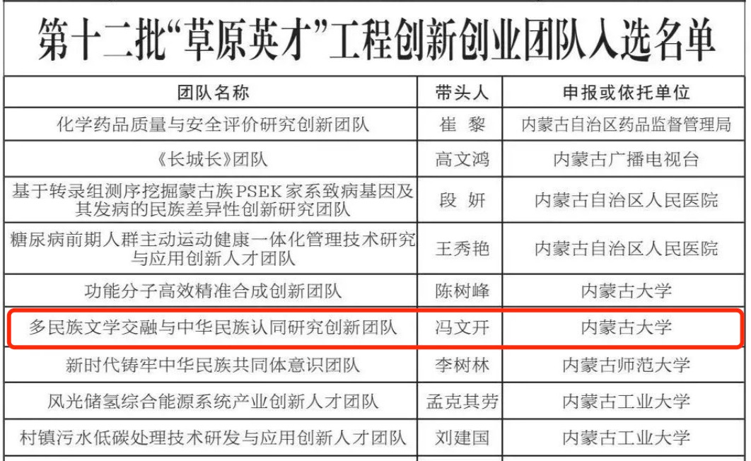 近日,内蒙古自治区党委人才工作领导小组办公室公示了第十二批“草原英才”工程入选名单,公司教师冯文开领导的多民族文学交融与中华民族认同研究创新团队入选创新创业团队;内蒙古自治区人力资源和社会保障厅公示了2022年度内蒙古自治区“草原英才”工程青年创新创业人才拟入选人员名单,公司教师付建荣入选创新人才一层次。入选“草原英才”工程是对公司教师学术创新能力的肯定与激励,同时也极大激发了公司全体师生的学术创新热情。
