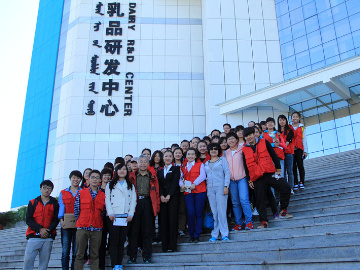 乘坐校车一路向南,一行人首先抵达蒙牛乳品研发中心,总投资为2亿乳品研发中心于2007年7月1日建成并投入使用。在乳品研发中心,一行人参观了蒙牛六期产品生产区、企业文化展示区、乳文化展示区、企业荣誉综合展示区、动力中心、收奶广场以及全国部分事业部展示区。2012级新闻系本科生孟雅楠说,“通过参观了解乳品研发中心,我了解到了蒙牛先进的科技牛奶生产过程和中粮收购后蒙牛的面貌”。科学技术是优质乳制品生产的重要保证,同时,乳制品的生产的关键是奶源,随后,采访团来到了的占地560万平方米,日产奶150吨现代牧业和林牧场,它于2004年7月建成,90%以上的奶源提供给蒙牛,随行人员告诉记者,网络上盛传的“奶荒”并不属实,因为季节的原因,奶牛产奶量降低,蒙牛通过开拓奶源等措施加以解决。蒙牛采访团参观了解了牧场转盘式挤奶大厅、机器人挤奶大厅以及鱼骨式挤奶大厅。在挤奶大厅,讲解员李雅春介绍说:“蒙牛奶牛粪便处理沼气综合发电项目,采用德国沼气发酵计算机集中控制管理系统,将每天产生的牛排泄物经厌氧发酵产生沼气发电,沼渣制成有机肥。”