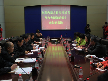 参观之后,经过短暂的午餐时间,内大师生一行与包钢各位领导人在座谈会上进行了深入的探讨,首先由包钢负责人李主任对包钢的收益情况,建设发展,管理模式,环保工作、发展目标等几个方面的关于我们做简要介绍,接着内大师生分为五个小组对包钢生产、技术、稀土、人事、环保五个方面的情况做了细致的采访,对于包钢发展有了进一步详细的了解。