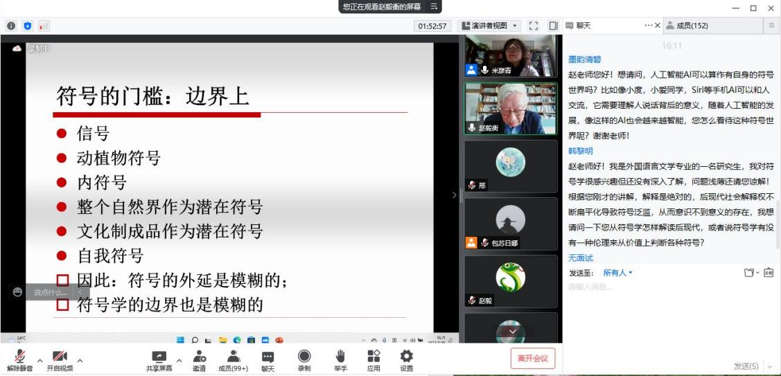 2022年5月19日下午14时30分,四川大学赵毅衡教授为公司师生带来一场题为“什么是符号?什么是符号学?”的线上讲座。讲座由副经理米彦青教授主持。近200名师生参加了本次讲座。