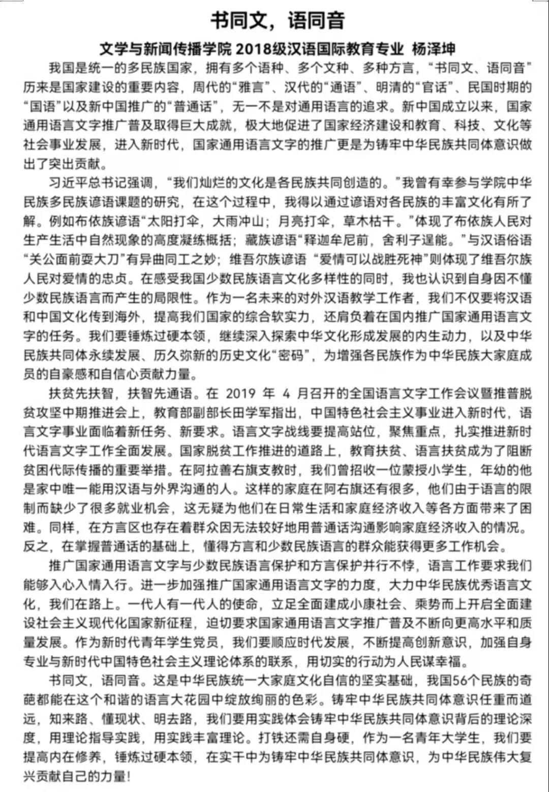 9月13日,2018级汉语国际教育专业团支部以“铸牢中华民族共同体意识”为主题,举行了线上团日活动。支部团员均参与到讨论之中,积极发言。同学们结合近期的思政学习,交流对“中华民族共同体意识”的理解;部分同学也分享了自己的实践经历和所见所感。杨泽坤同学分享到:“扶贫先扶智,扶智先通语。书同文,语同音,这是中华民族统一大家庭文化自信的坚实基础,作为一名青年老员工,我们要提高内在修养,锤炼过硬本领,在实干中为铸牢中华民族共同体意识,为中华民族伟大复兴贡献自己的力量!”