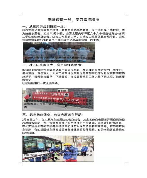用雷锋精神描绘“志愿红”,公司员工组织成员一直在路上。职业发展部陈闻笛同学与舍友们随PA视讯官方网站微尘志愿者协会到达晓霞特教康复中心开展志愿活动,为残障的小天使们送去关爱,感悟生命的另一种真谛;综合协调部李昊宇同学善于发现生活中的无名战士,默默用文字记录了太原火车站边20多名志愿者开展志愿活动的奉献举动;学习实践部阿苏茹同学心怀崇敬之心,认真整理了当代雷锋的感人事例......
