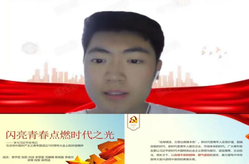 青马班第五组汇报人高文静同学将小组汇报内容分为青年之声、时代印记、青春追求三个部分。其中,她用MV《向着光,成为光》向大家展现当代奋斗青年的青春缩影。百年前,中国青年挺身而出,照亮了沉沉黑夜,成为了不可磨灭的那束光;百年后的今天,中国青年把梦想的种子埋在心底,在光合作用下奋力生长,他们相信光,追寻光,向着光,冲破泥土再次绽放。小组成员刘雅杰同学有力发声:广大青年应当继续以实干为先,以团结为先,让优良传统继承牢牢把握在我们党和团的宣传阵营中,在第二个百年目标、新征程的青年赛道上不断前进!