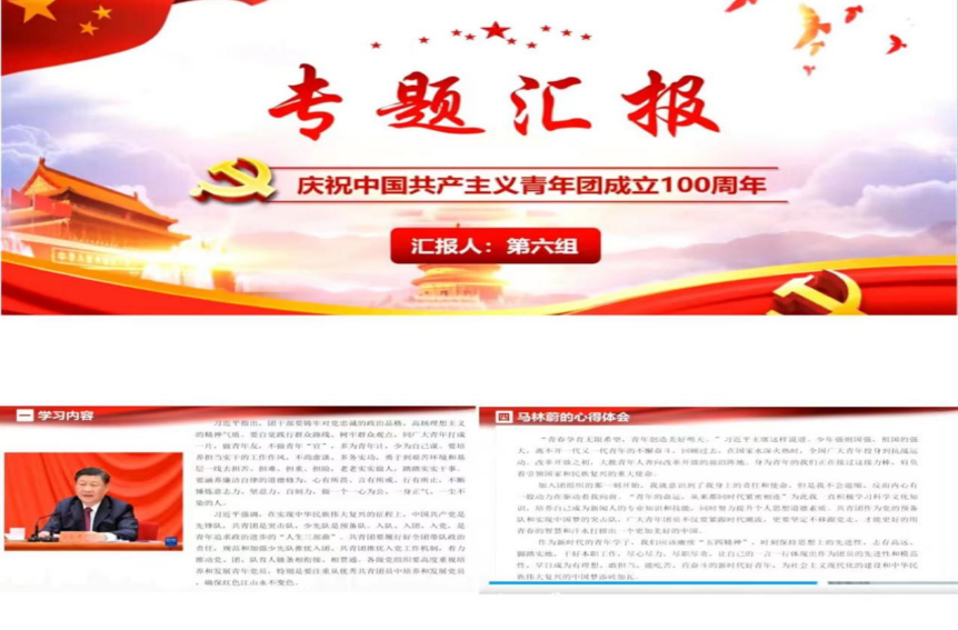青马班第二组汇报人樊文卓同学用四个关键词:“听党话、跟党走”“坚定理想信念”“永葆奋斗精神”“站稳人民立场”串连学习内容。鲜红的共青团团旗上,黄色的圆圈围绕着五角星,象征着广大青年紧密团结在中国共产党的周围。她以习近平总书记殷切的话语作结:“青年犹如大地上茁壮成长的小树,总有一天会长成参天大树,撑起一片天。青年又如初升的朝阳,不断积聚着能量,总有一刻会把光和热洒满大地。党和国家的希望寄托在青年身上!”
