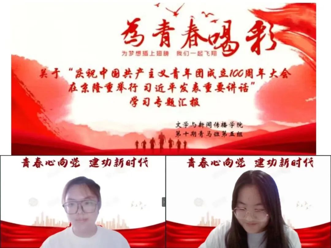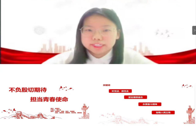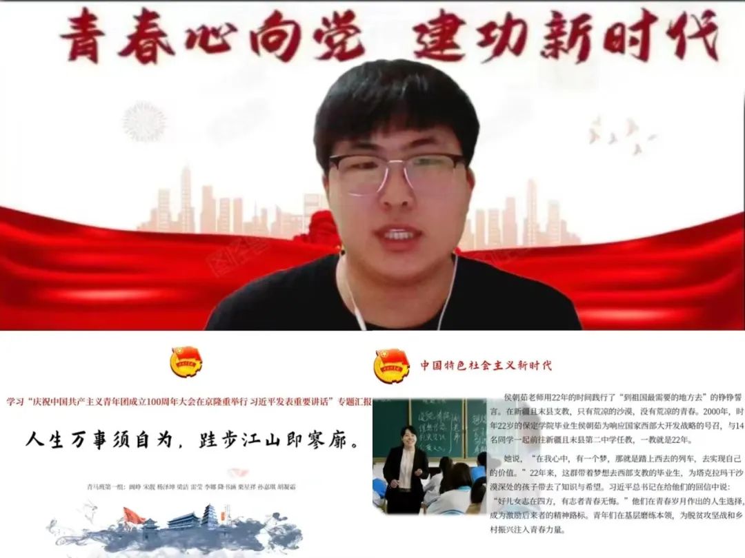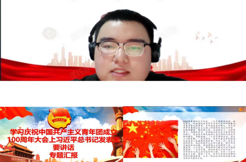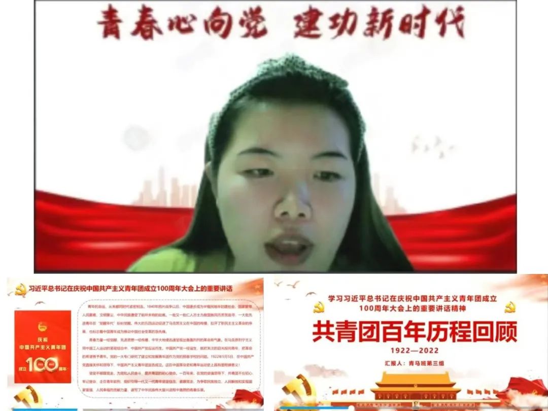 5月21日晚7:00,公司于腾讯会议平台组织青马班开展“学习习近平总书记在庆祝中国共产主义青年团成立100周年大会上的重要讲话精神”专题团课汇报展示,公司团总支副书记任文秀老师出席并主持本次活动,第十期青马班全体学员、2022年春季学期入团积极分子参加活动。学员们认真聆听学习习近平总书记重要讲话,深受鼓舞、倍感振奋,并结合所思所想以小组为单位进行汇报展示。