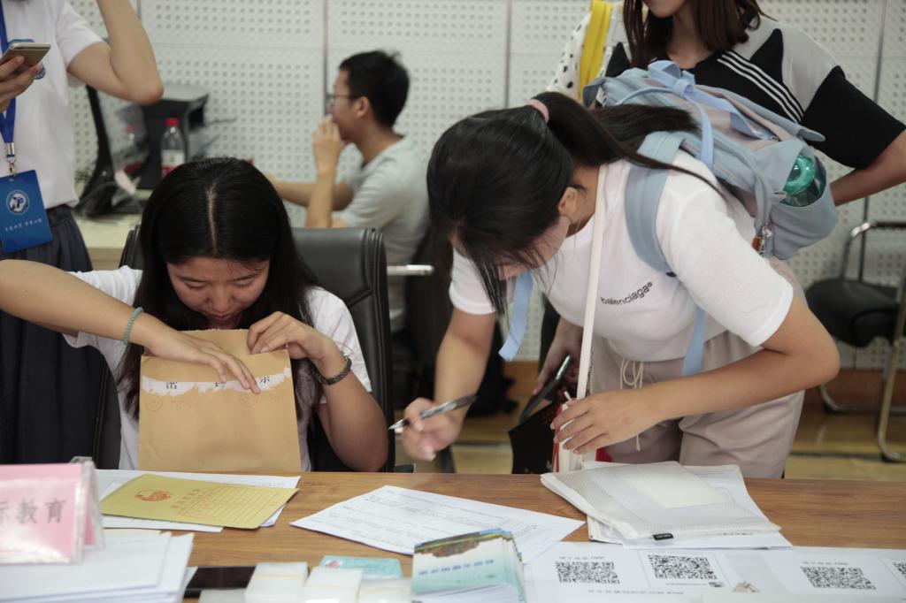 档案收取,信息核对,材料发放,耐心讲解,室内报到点温柔关怀,认真回答新生问题,引导他们完成注册报到。