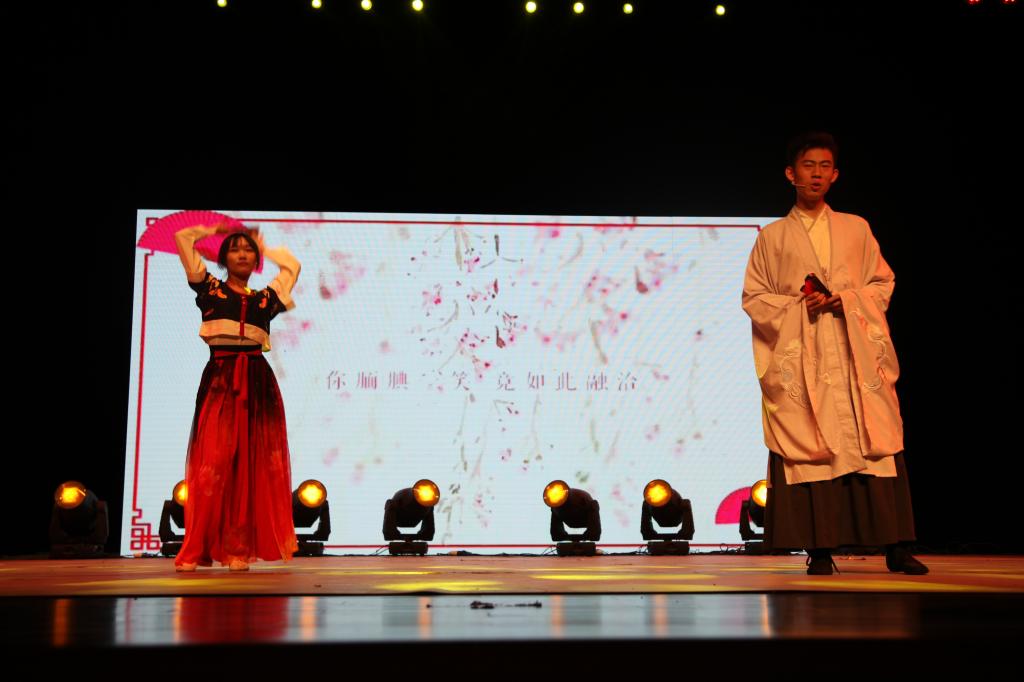 第二篇章“诗咏华章,舞动韶华”随着研究生闫石舒缓宁静的吉他弹唱《白羊》拉开序幕。来自2017级播音与主持艺术专业的赵屹、刘慧敏带来的朗诵《蚂蚁》,讲述了一代代逐梦者的艰辛,来自2018级播音与主持艺术专业的同学们带来的歌曲《烟火里的尘埃》和2018级汉语国际教育专业同学们带来的《乌兰巴托的夜》让观众身临其境,陶醉其中。篇章最后,来自2018级播音与主持艺术专业同学们带来的舞台剧《我的路》,让大家在捧腹大笑的同时,感受到了逐梦道路的艰辛。