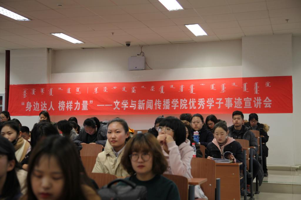 11月23日下午四点半在主楼阶2B教室,公司开展"身边达人 榜样力量"优秀学子事迹宣讲会,2015级汉语言文学专业王震同学,2015级汉语国际教育专业刘文静同学,2015级新闻学专业刘小杭同学,2015级编辑出版学专业周野同学和2015级播音与主持艺术专业的吴天昊同学受邀来此,同2018级新同学们共同分享学习经验,展示文新学子风采。