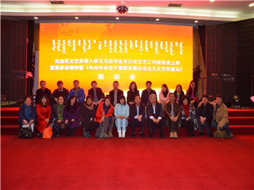 张宇书记全文传达了《中共中央关于繁荣和发展社会主义文艺的意见》文件精神。自治区文联副主席尚贵荣、自治区书法家副主席张树天、自治区著名评论家刘成、自治区作协副主席、著名作家肖亦农、自治区作协副主席海德才、自治区美术家协会副主席董崇明和翻译家协会副主席海日寒教授相继发言。他们就作家、艺术家在新时期的责任意识与担当;文艺在社会主义市场经济条件下的作用;如何创作中国精神、中国气派的作品,使之具有追求真善美,抨击假丑恶的力量;如何切实提高作家、艺术家的学养、涵养、修养,让作品有筋骨、有道德、有温度、有力度、有艺术震撼力,像蓝天上的阳光,春天里的清风,真正做到为人民抒写,为人民抒情,为人民抒怀;切实做到扎根生活,服务人民,下大力气创作出无愧于人民、无愧于时代的精品力作等方面发表了自己的真知灼见和肺腑之言。