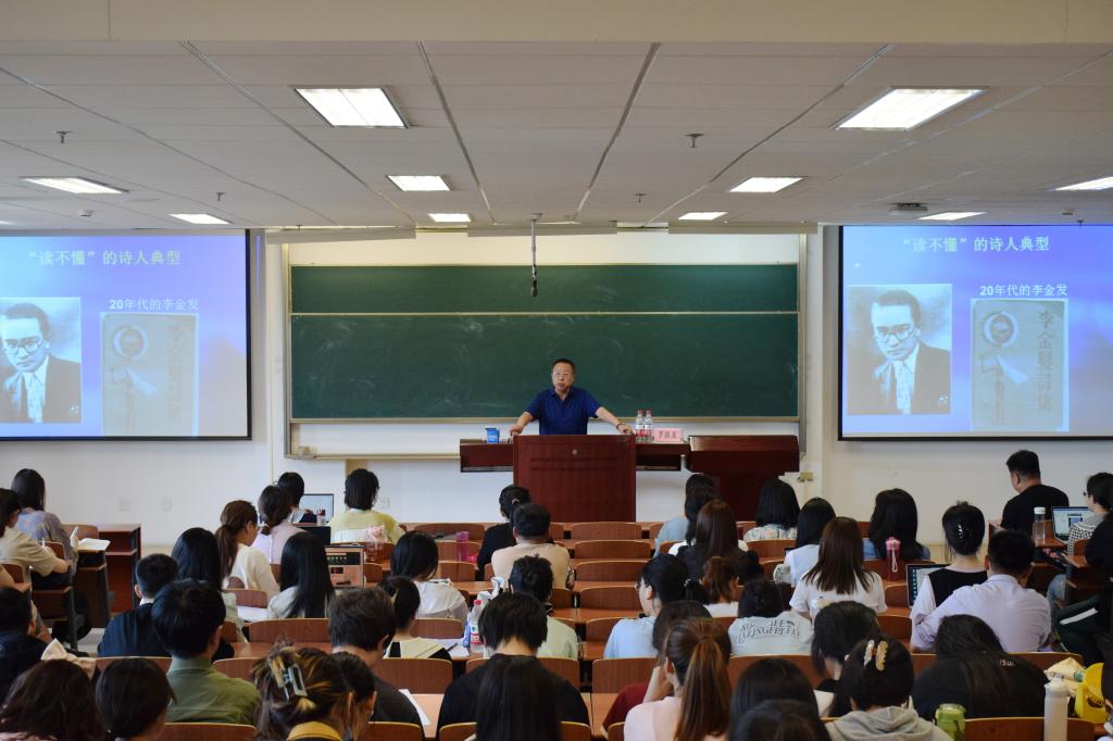 讲座开始,罗振亚教授以“不识庐山真面目,只缘身在此山中”为引,从新诗“读不懂”的话题着手,选取了新诗史上几位“读不懂”的典型诗人及其代表作进行分析,阐释了诗歌从“无解”到“无需解”的过程。罗教授提出,判定某时代是否为诗歌繁荣时期的标准之一,就是看该时代有无经典偶像和天才代表。
