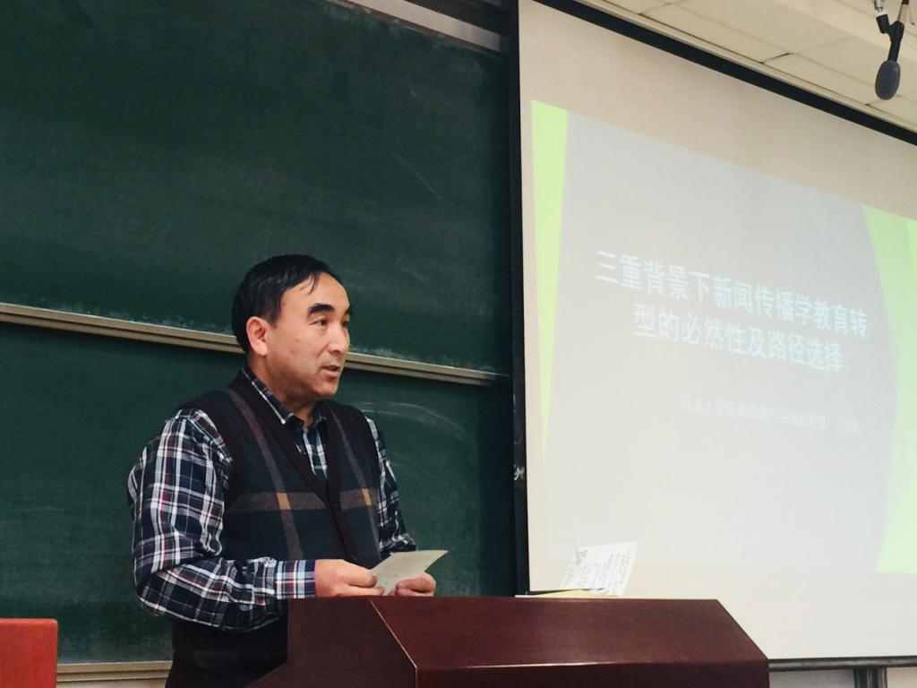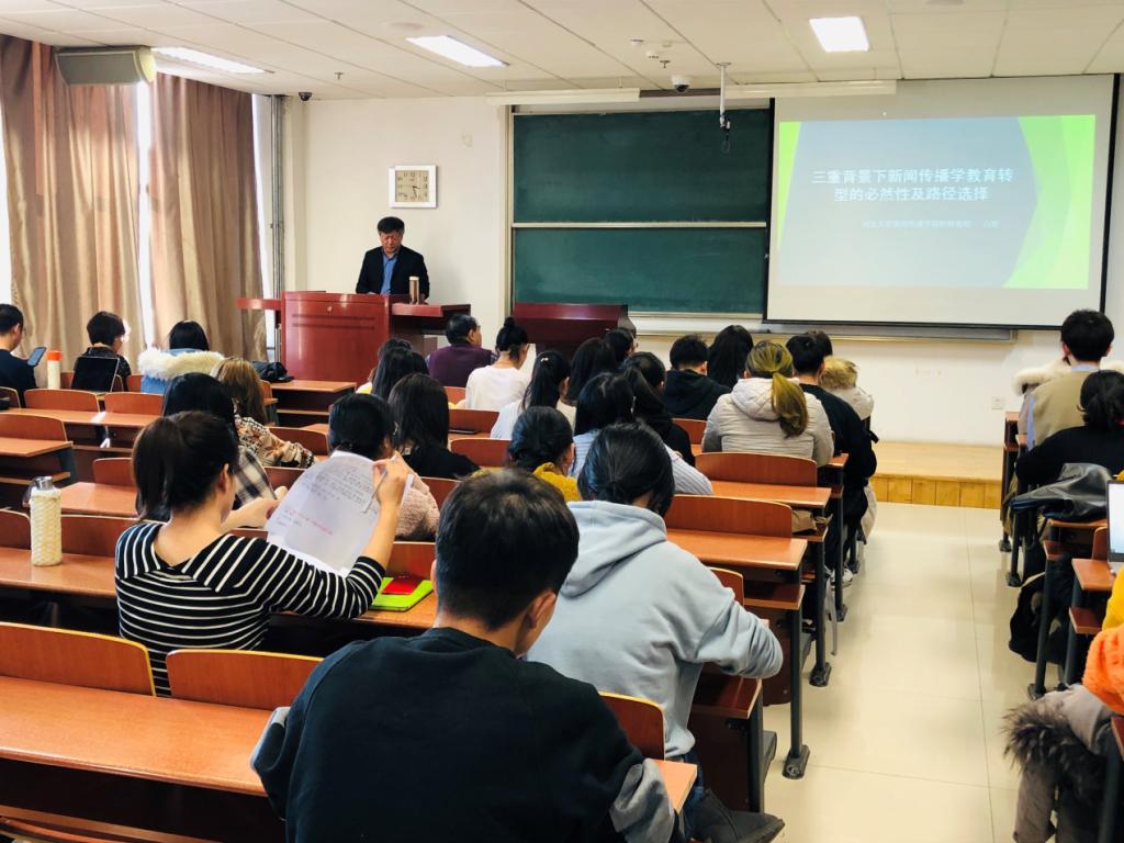 12月17日下午,公司邀请河北大学白贵教授进行学术交流并为师生做了题为《三重背景下新闻传播教育转型的必然性及路径选择》的学术讲座。讲座由党总支书记乔旺主持,副经理张丽萍教授,新闻系主任刘寒娥教授,新闻系部分教师及新闻专业研究生参加讲座。
