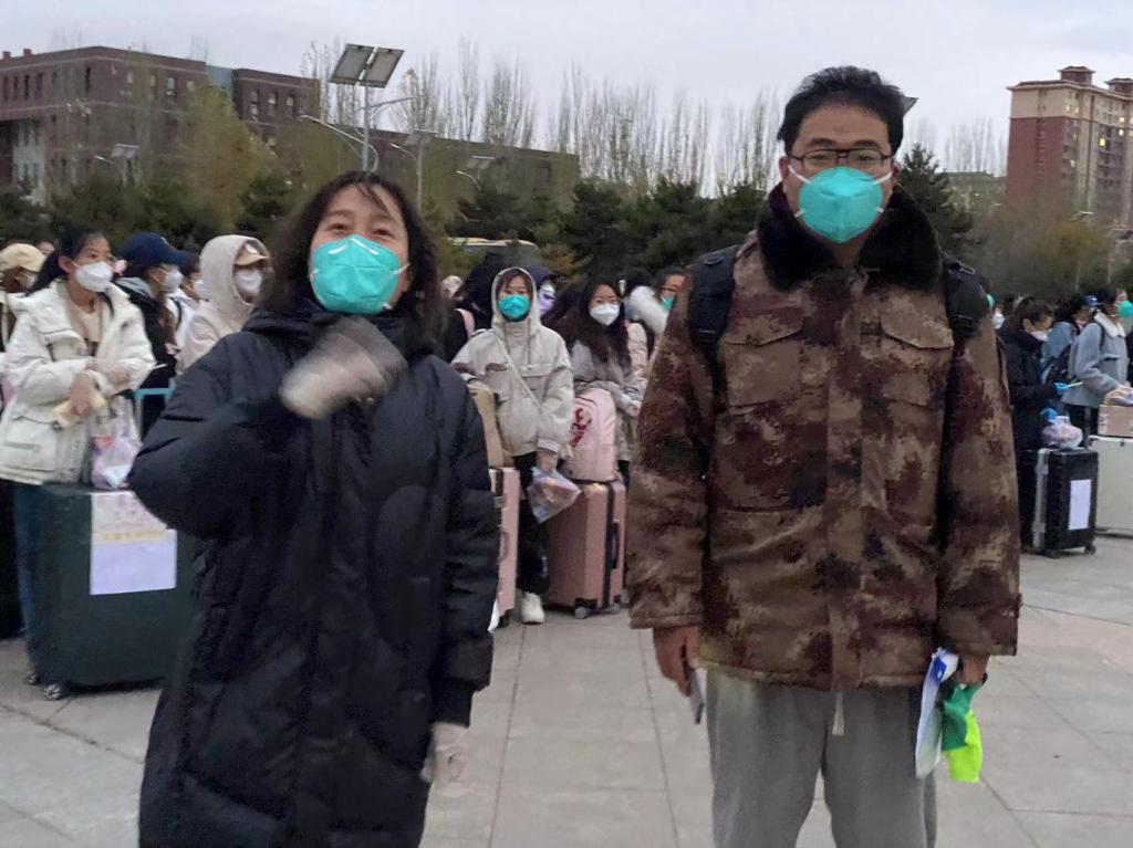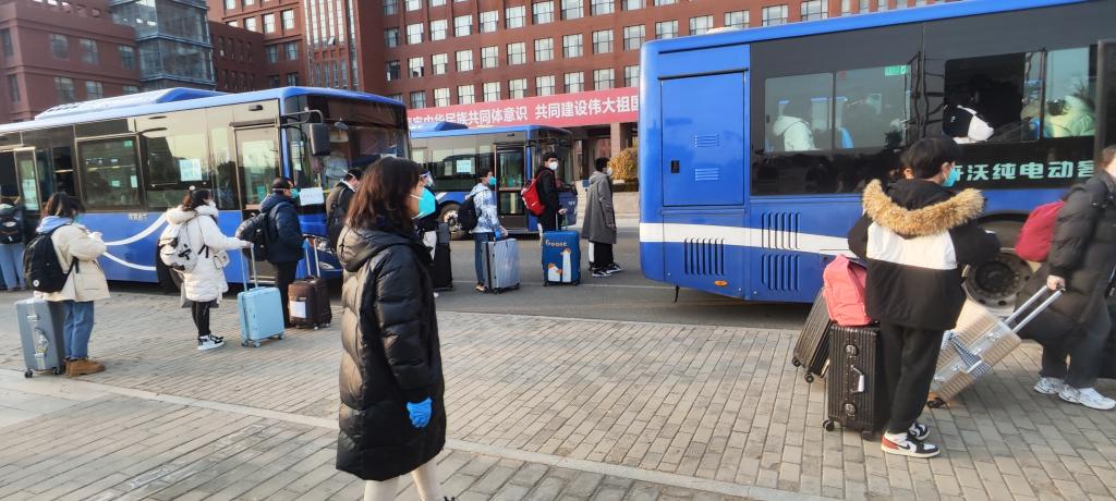 与此同时,经理米彦青正带领驻校教师组织公司最大规模的赤峰、通辽、锡林郭勒盟籍共166名员工按批次上车。米彦青老师站在广场上大声给员工点到,生怕1名孩子落下,反复叮嘱孩子们戴好口罩,做好防护,看管好行李。而驻校老师们争先恐后抢着每天凌晨送员工登车返乡,觉得自己多做一点,团队伙伴就能稍微歇歇喘口气。