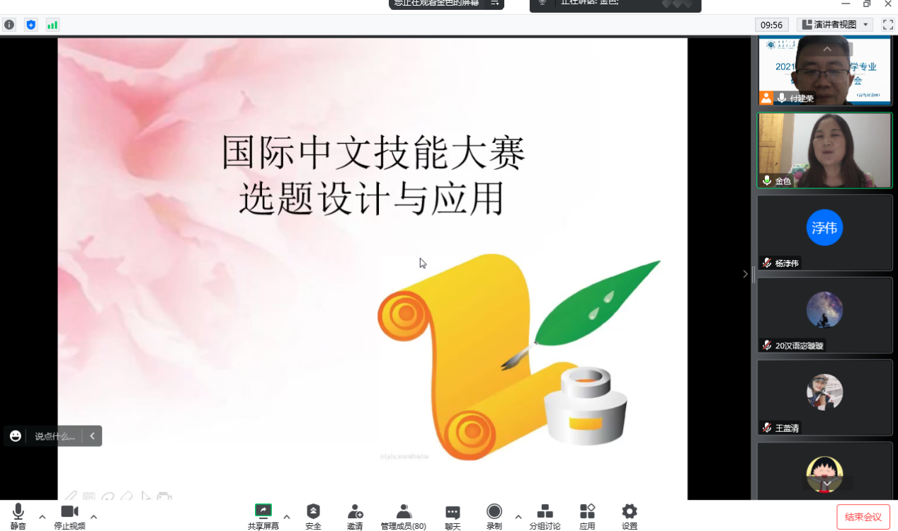 12月19日晚上19:00,汉语国际教育“国家一流本科专业建设系列讲座”第三讲开讲,公司国际教育公司赵金色老师为汉教专业同学带来了一场“国际中文技能大赛选题设计与应用”的线上讲座,讲座由汉语系主任付建荣教授主持,来自汉教专业的80余名同学参加了本次讲座。