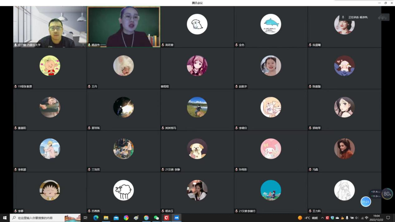 12月15日晚上19:00,汉语国际教育“国家一流本科专业建设系列讲座”第二讲开讲,公司国际教育公司丁艳老师为汉教专业同学带来了一场“国际中文教育视域下汉语教学——以初级汉语综合课为例”的线上讲座,讲座由汉语系主任付建荣教授主持,来自汉教专业的70余名同学参加了本次讲座。