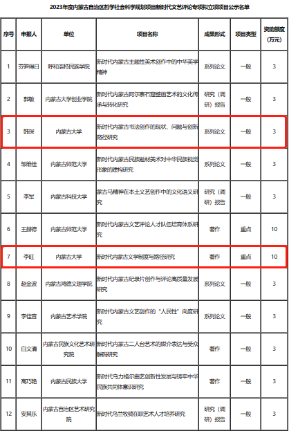 9月18日,2023年度内蒙古自治区哲学社会科学规划项目新时代文艺评论专项拟立项项目名单进行公示,公司李旺老师获批重点项目(资助10万),韩琛老师获批一般项目(资助3万)。