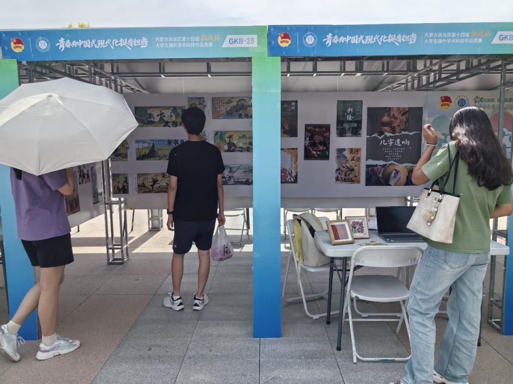 活动现场,色彩斑斓、创意十足的海报整齐排列,生动展现了黄河几字弯地区丰富多样的非物质文化遗产。每张海报都巧妙融合传统非遗元素与现代设计理念,将剪纸、刺绣、石雕等非遗项目以新颖的视觉艺术形式呈现,通过精心的色彩搭配和独特的构图布局,为传统非遗赋予了新的表现力,引得众多师生驻足观赏、拍照打卡。