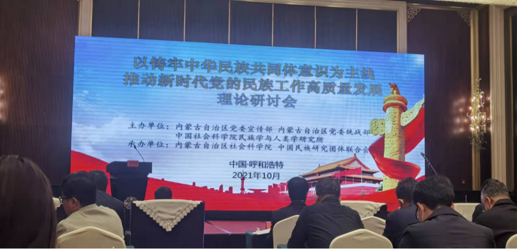2021年10月17日,我和导师共同参加了由内蒙古自治区党委宣传部、统战部、中国社会科公司民族学与人类学研究所联合主办的“以铸牢中华民族共同体意识为主线,推动新时代党的民族工作高质量发展”理论研讨会,会议在呼和浩特内蒙古饭店举行。来自国家部委、高端智库、自治区各界和全国少数民族地区的120多位专家学者,对铸牢中华民族共同体意识的理论体系、方法路径展开了深入研讨。