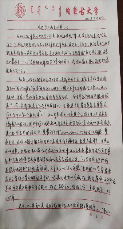 作为青年一代的我们,应该积极学习百年党史,了解党的光荣传统、宝贵经验和伟大成就,用党的奋斗历程和伟大成就鼓舞斗志、明确方向,用党的光荣传统和优良作风坚定信念、凝聚力量,用党的实践创造和历史经验启迪智慧、砥砺品格,以优异成绩迎接建党一百周年。