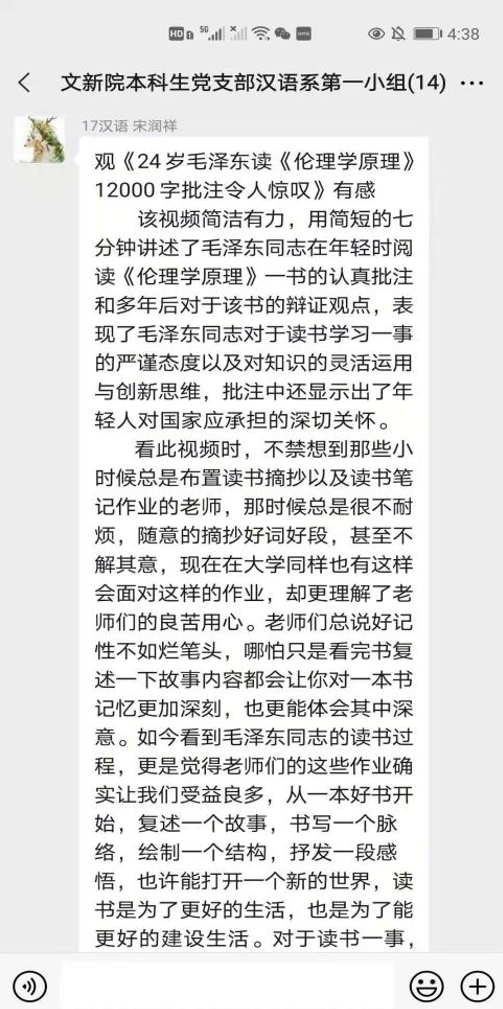 为纪念中国共产党建党100周年,引导党员们追忆初心,重温历史,“学史明理、学史增信、学史崇德、学史力行”,绘就精神底色,坚定理想信念,汲取前行力量,公司本科生党支部积极创新党史学习形式,于5月24日开展了“夜校小黑板”第一次线上集中学习党史学习教育活动,组织支部成员观看了《红色档案·24岁毛泽东读<伦理学原理>12000余字批注令人惊叹》的视频,视频观看结束后党员们积极交流观看心得。