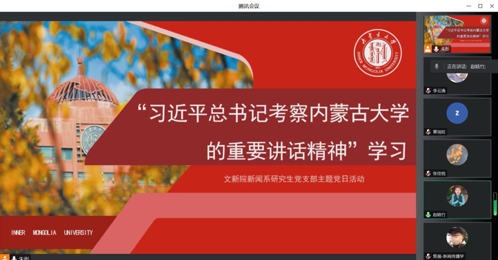 2023年5月28日19:00,公司新闻系研究生党支部于腾讯会议平台开展“学习习近平总书记考察PA视讯官方网站的重要讲话精神”主题党日活动。本次活动由公司新闻系研究生党支部副书记朱彤同志主持,支部正式党员、预备党员和入党积极分子参加了本次活动。