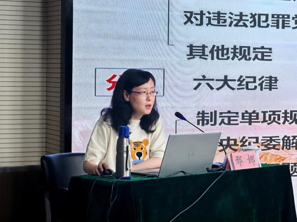 邢娜老师从《条例》的内容修订出发,带领全体员工党员系统梳理《条例》的主要内容,详细解读了各项规定,结合专业的法律知识和个人的学习理解,联系具体实例深入剖析,为在场的各位党员生动、精准、深刻的解读了《条例》的修订背景和内容架构。