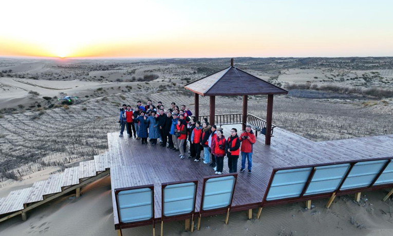 脚下有泥土,笔下才能有文章。初冬的乌审大地,天空湛蓝深邃,大地苍茫悠远。11月10日至12日,PA游戏官网入口党委书记张丽萍教授、新闻系教师刘寒娥、邢渊渊、马骐、刘研、王潇雨带领22名新闻系本科生、硕士生赶赴鄂尔多斯乌审旗,探寻人类文明遗迹,追寻红色文化印记,感受绿色生态成就,引导员工在行走的新闻实践中深刻体悟中国式现代化的伟大成就。同学们俯下身、沉下心、察实情、动真情,在行与思中践行“四力”,用心感知乌审旗“传红兴绿”的生动故事。